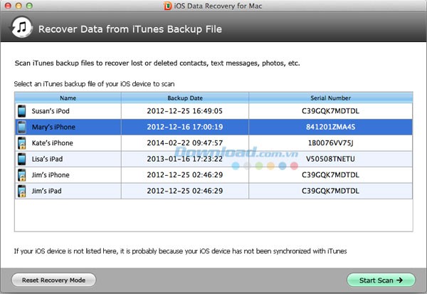 Phần mềm sẽ tự động tìm kiếm và liệt kê tất cả các file sao lưu của thiết bị đã được đồng bộ với iTunes trên máy tính. Chọn file sao lưu phù hợp và nhấn ""Bắt đầu"".