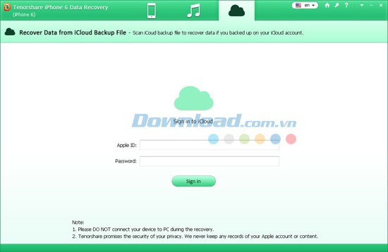 Sau khi chạy Tenorshare iPhone 6 Data Recovery, truy cập biểu tượng iCloud. Bạn sẽ thấy một cửa sổ yêu cầu đăng nhập. Nhập tài khoản iCloud và mật khẩu.