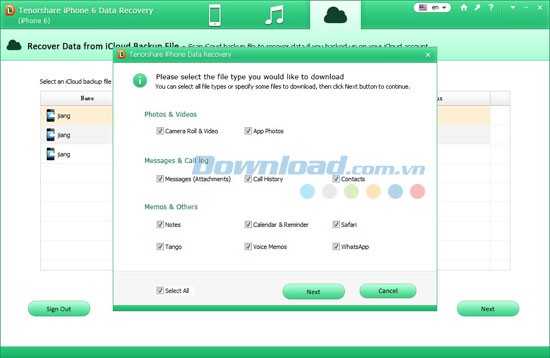 Sau khi đăng nhập, bạn sẽ thấy danh sách các file backup trong iCloud. Chọn file cần thiết và loại tập tin muốn tải, sau đó nhấn ""Tải xuống"".