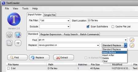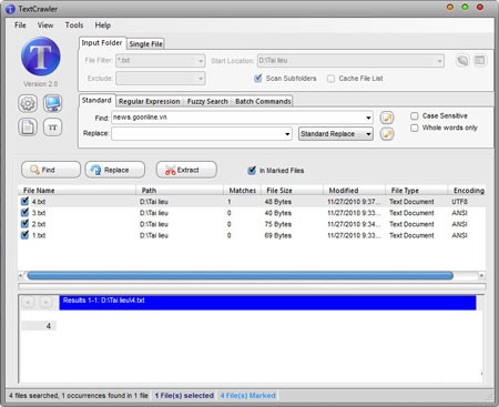 TextCrawler 2.0 hỗ trợ hoàn toàn bảng mã Unicode, cho phép bạn tìm kiếm các từ khóa có dấu tiếng Việt một cách chính xác. Để thay thế từ khóa vừa tìm được bằng một từ khác, hãy nhập nội dung mới vào ô Replace và nhấn nút Replace.
