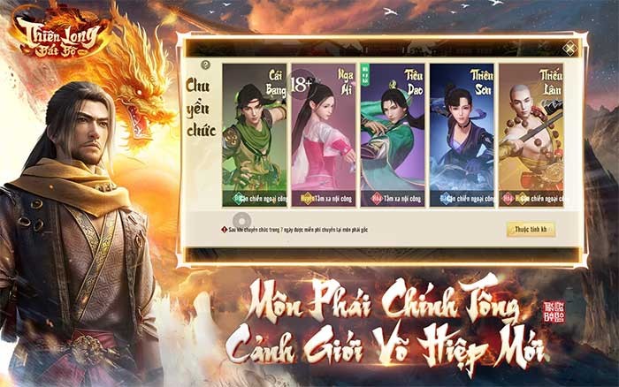 Ngay khi khởi động, người chơi sẽ có cơ hội lựa chọn một trong số các môn phái độc đáo (ví dụ: Minh Giáo, Thiên Sơn, Nga My, Đường Môn...), mỗi môn phái sở hữu phong cách chiến đấu và bộ kỹ năng đặc trưng. Hãy cân nhắc và chọn môn phái phù hợp với sở thích cá nhân của bạn (tấn công tầm gần, sử dụng phép thuật, hỗ trợ đồng đội...).
