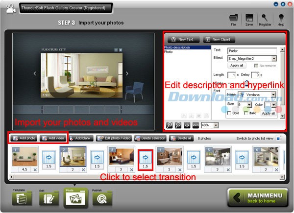 Đến trang "", bạn sẽ nhập các hình ảnh và video mong muốn. Các hiệu ứng chuyển tiếp sẽ được tự động thêm vào; bạn có thể nhấp vào hộp Transition Effect để tùy chỉnh các hiệu ứng giữa các ảnh. Đồng thời, hãy chỉnh sửa mô tả cho từng ảnh hoặc video và thêm các liên kết (hyperlink) nếu cần.