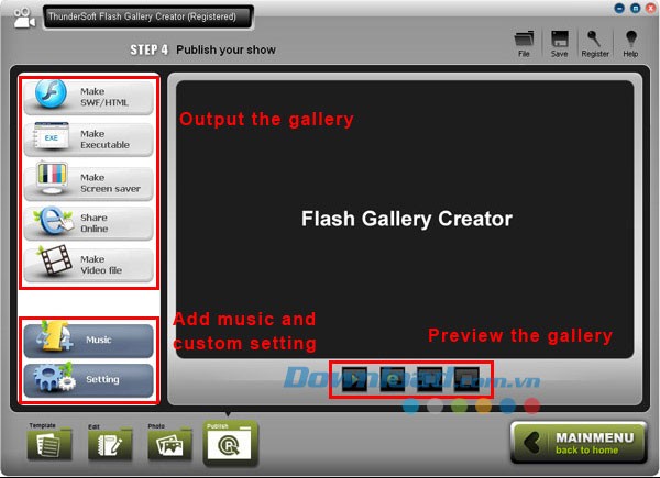 Truy cập trang "". Bạn có thể thêm một bài hát làm nhạc nền bằng cách nhấn nút "". Tiếp theo, nhấn "" để thiết lập các tùy chọn xuất, bao gồm: FPS, chất lượng hình ảnh, v.v. trước khi tiến hành xuất. Hãy xem trước thư viện ở chế độ toàn màn hình để đảm bảo mọi thứ đã được sắp xếp chính xác. Để tạo thư viện ảnh web, hãy xuất file dưới dạng SWF và nhúng vào trang web của bạn. Ngoài ra, bạn cũng có thể xuất thư viện dưới dạng file thực thi, ảnh nền hoặc định dạng video. Nếu muốn chia sẻ thư viện với người khác, hãy nhấn nút "". Họ sẽ nhận được đường dẫn (link) ngay sau khi quá trình tải lên hoàn tất.