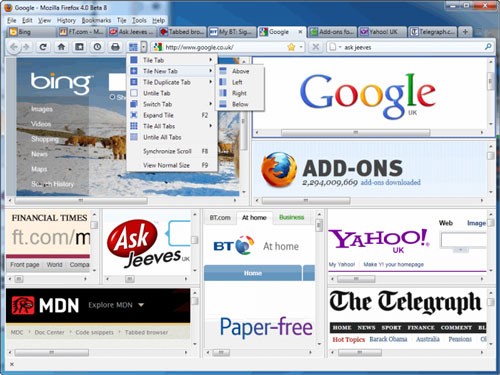 Như tên gọi của nó, Tile Tab cho phép bạn sắp xếp các tab đang mở trên Firefox theo kiểu "lợp ngói" trực quan. Khi có nhiều tab được mở, bạn có thể sử dụng các tùy chọn trong menu để bắt đầu sắp xếp.