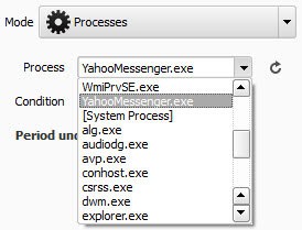 Processes: Thực hiện tác vụ khi một ứng dụng đang mở bị đứng. Tùy chọn này áp dụng cho tất cả các ứng dụng đang chạy. Bạn nhấn vào nút mũi tên tại trường Process để chọn ứng dụng, sau đó chọn trạng thái của tác vụ là Run (đang chạy) hoặc Not Run (không chạy) tại mục Condition. Cuối cùng, nhập thời gian đếm lùi vào ô Period under review.
