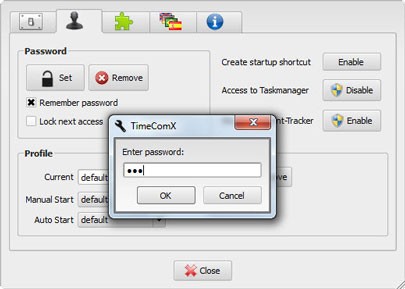 Để bảo vệ chương trình khỏi những người không mong muốn, bạn nên thiết lập mật khẩu. Bạn nhấn vào nút Options ở góc trên bên trái giao diện chính, chọn thẻ có biểu tượng ổ khóa. Sau đó, nhấn Set tại mục Password, nhập mật mã vào ô Enter password và nhấn OK để xác nhận.