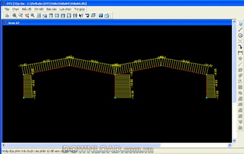 Môi trường đồ họa của phần mềm cung cấp các biểu diễn trực quan về kết quả tính toán, bao gồm sơ đồ kết cấu, tải trọng tác dụng, độ chuyển vị, và các biểu đồ nội lực quan trọng như mô men uốn, lực cắt, lực dọc. Đồng thời, phần mềm hiển thị biểu đồ bao nội lực và sơ đồ tiết diện của các cấu kiện thanh.