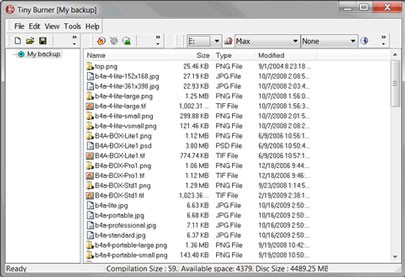 Hỗ trợ nhiều loại đĩa: Tiny Burner tương thích với nhiều định dạng đĩa khác nhau, bao gồm CD-R/RW, DVD-R/RW, DVD-R DL, DVD+R/RW, DVD+R DL, BD-R/RE, BD-R/RE DL, HD-DVD-R/RW và DVD-RAM.