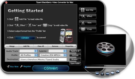 Tipard BlackBerry Video Converter for Mac là phần mềm hỗ trợ người dùng biên tập và chuyển đổi các định dạng video, đảm bảo chất lượng hiển thị tốt nhất trên các thiết bị BlackBerry. Chương trình có khả năng chuyển đổi từ nhiều định dạng phổ biến như MPV, MOD, TOD, HD video, FLV video sang các định dạng tương thích với BlackBerry như AVI, MP4, WMV, 3GP.