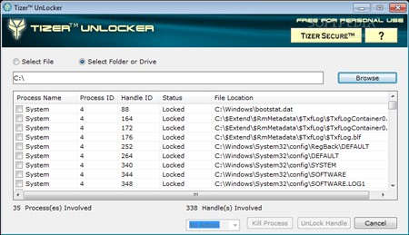 Tizer Unlocker cho phép bạn đổi tên, di chuyển hoặc xóa các tập tin và thư mục vốn bị khóa tạm thời bởi các ứng dụng khác. Bạn có thể chọn một file, thư mục hoặc toàn bộ ổ đĩa để xem danh sách các tiến trình đang khóa chúng.