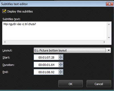 Bạn có thể chỉnh sửa nội dung từng dòng phụ đề bằng cách nhấp chuột vào dòng đó và nhấn nút Edit. Trong hộp thoại Subtitles, sửa lại nội dung phụ đề trong hộp Subtiles text. Hộp Layout cho phép bạn thay đổi vị trí đặt phụ đề trên màn hình. Hộp Start và End xác định thời điểm bắt đầu và kết thúc hiển thị phụ đề, còn Duration là khoảng thời gian hiển thị.