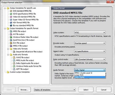Vì mục đích cuối cùng là ghi file video ra đĩa DVD, tôi khuyến nghị bạn chọn DVD standard MPEG file. Sau đó, thiết lập các thông số như Video system (NTSC hoặc PAL), Encode mode (chất lượng hoặc tốc độ), Aspect ratio (4:3 hoặc 16:9) và Audio format (MPEG-1 Audio Layer II, Liner PCM hoặc Dolby Digital). Cuối cùng, nhấn Select.