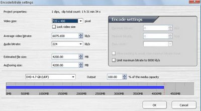 Trong cửa sổ Encode/bitrate settings, chương trình sẽ tự động thiết lập các thông số về kích thước khung hình, bitrate của video và âm thanh để đảm bảo dung lượng file mpg xuất ra vừa đủ để ghi lên một đĩa DVD 4,7GB. Tuy nhiên, bạn có thể điều chỉnh thanh màu xanh da trời về phía trái để giảm dung lượng file mpg nếu cần thiết. Sau đó, nhấn OK.