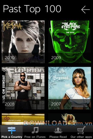 Ứng dụng cung cấp đầy đủ dữ liệu về bảng xếp hạng âm nhạc bán chạy nhất tại thị trường Mỹ, trải dài từ năm 1982 đến năm 2011. Đồng thời, người dùng cũng có thể theo dõi bảng xếp hạng top 100 hiện tại của hơn 20 quốc gia khác nhau.
