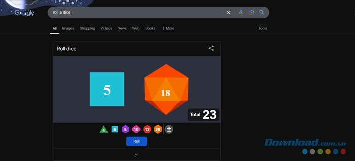 Chỉ cần thực hiện một tìm kiếm với từ khóa "Roll a die" (lăn xúc xắc), bạn sẽ nhận được một kết quả ngẫu nhiên.
