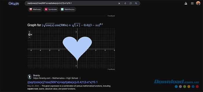 Thử tìm kiếm với cụm từ (sqrt(cos(x))*cos(500*x)+sqrt(abs(x))-0.4)*(3-x*x)^0.1, bạn sẽ thấy một trái tim được tạo ra từ đồ thị hàm số xuất hiện trên kết quả tìm kiếm.