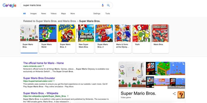 Cụ thể, trên thẻ thông tin hiển thị phía bên phải kết quả tìm kiếm, bạn sẽ thấy một yếu tố quen thuộc từ trò chơi. Với Super Mario Bros, một dấu chấm hỏi cùng những chấm tròn đặc trưng của Mario sẽ xuất hiện và phát ra âm thanh quen thuộc.