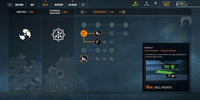 Nếu bạn thường xuyên phải sử dụng vật phẩm hồi phục, việc nâng cấp Daikoku I là một quyết định hợp lý. Kỹ năng này giúp tăng số lượng vật tư tiêu hao mà bạn có thể mang theo, từ 3 lên 5 cho mỗi loại.