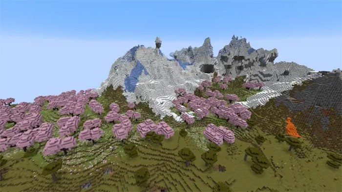 Seed này sở hữu một khung cảnh thiên nhiên vô cùng bắt mắt tại biome Cherry Grove, kề cận với dãy núi phủ tuyết cao sừng sững. Một khu vực nhỏ của rừng hoa anh đào được bao bọc hoàn toàn bởi những đỉnh núi trắng xóa, mang đến cảm giác yên bình và thơ mộng.
