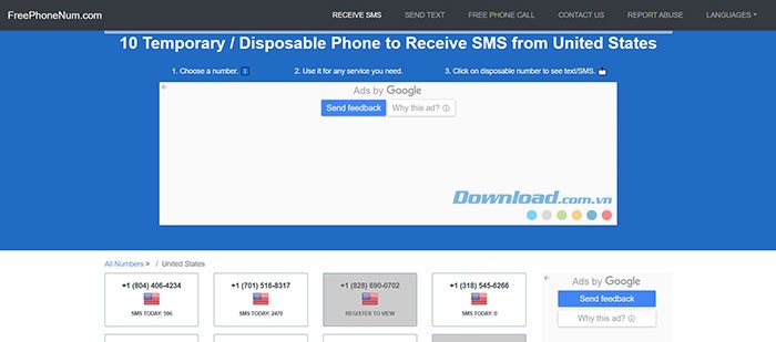 Fakenum cung cấp một danh sách gồm 5 số điện thoại, tất cả đều thuộc lãnh thổ Hoa Kỳ. Quá trình sử dụng vô cùng đơn giản: chỉ cần nhấp vào nút Receive Free SMS và lựa chọn số điện thoại bạn muốn sử dụng.