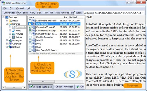 doc converterTotal Doc Converter tương thích với định dạng DocX (tài liệu Word 2007). Việc cài đặt Microsoft Office Compatibility Pack miễn phí cho phép chuyển đổi các file DocX sang nhiều định dạng khác nhau như HTML, PDF, XLS, JPG, TIFF, TXT thông qua Total Doc Converter.