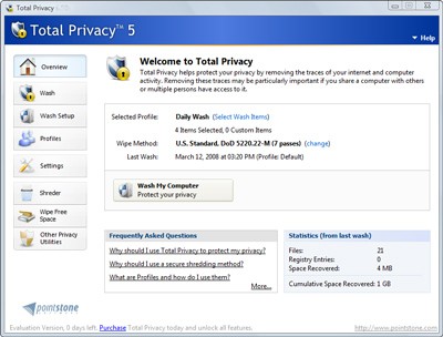 Total Privacy là một ứng dụng được thiết kế để đảm bảo an toàn và dễ dàng sử dụng, giúp bảo vệ dữ liệu cá nhân của bạn khỏi các yếu tố theo dõi. Công cụ này loại bỏ các dấu vết bạn để lại trên hệ thống, bao gồm Cookies, lịch sử duyệt web, file index.dat, và thậm chí cả dấu vết từ đồng nghiệp.