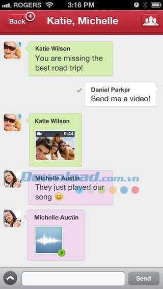 Trong khi tham gia một nhóm trò chuyện hoặc trao đổi tin nhắn riêng tư, người dùng Touch có thể thu âm/quay và gửi tin nhắn video hoặc hình ảnh.