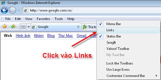 Nếu chưa thấy, bạn hãy nhấp chuột phải vào một vùng trống trên thanh Menu và chọn Links để kích hoạt nó.