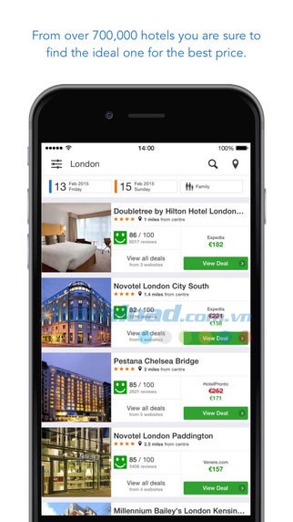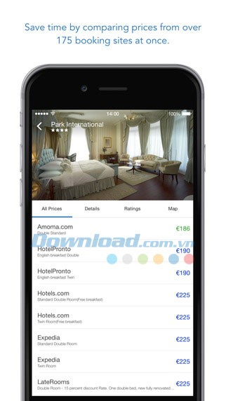 trivago for iOS mang đến cho người dùng cơ hội tiếp cận những ưu đãi giá rẻ cho khách sạn, thông qua việc so sánh từ 175 trang web đặt phòng trực tuyến hàng đầu thế giới.