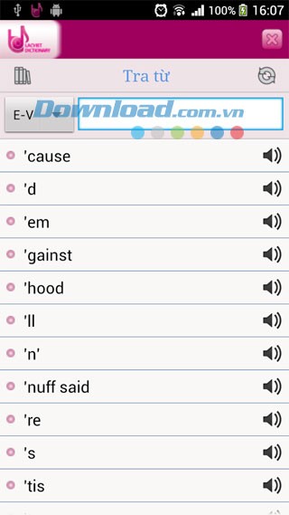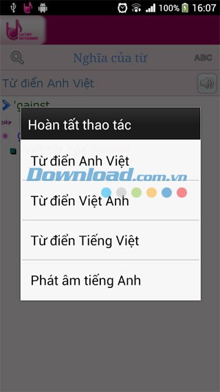 Giao diện ứng dụng được thiết kế đơn giản, trực quan. Tại góc trên bên trái, bạn có thể lựa chọn giữa các bộ từ điển Anh - Việt, Việt - Anh và Anh - Anh.