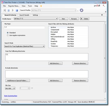 Twin Files Finder có khả năng tìm kiếm các bản sao hoàn toàn giống nhau (dù khác tên hoặc phần mở rộng) hoặc các tập tin có tên tương tự.