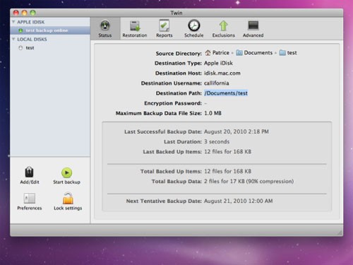 Twin được đánh giá là giải pháp sao lưu trực tuyến linh hoạt hàng đầu, được thiết kế đặc biệt cho hệ điều hành Mac OS X. Phần mềm này tương thích với đa dạng các máy chủ Internet phổ biến hiện nay, bao gồm FTP, FTPS, SFTP, WebDAV, Amazon S3 và MobileMe.