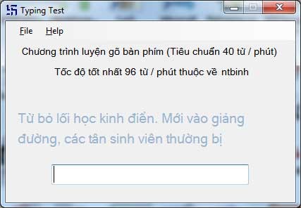 Typing Test là một công cụ hữu ích để rèn luyện kỹ năng gõ bàn phím Tiếng Việt. Đa số các ứng dụng luyện gõ hiện có thường tập trung vào ngôn ngữ Anh và thiếu khả năng tùy chỉnh nội dung luyện tập. Tuy nhiên, Typing Test đáp ứng đầy đủ các yêu cầu này.