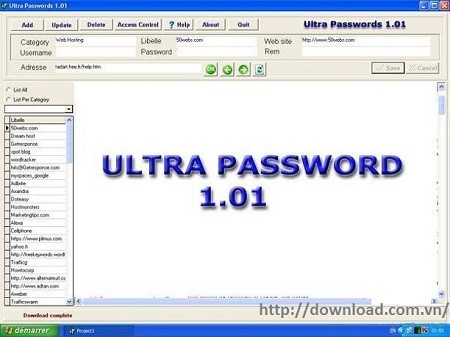Với Ultra Passwords, bạn có thể tập trung lưu trữ toàn bộ mật khẩu của mình – bao gồm mật khẩu cho các tài khoản con, mật khẩu FTP, mật khẩu diễn đàn, mật khẩu Myspace và nhiều loại mật khẩu khác – trong một cơ sở dữ liệu được bảo vệ bằng một mật khẩu chính.