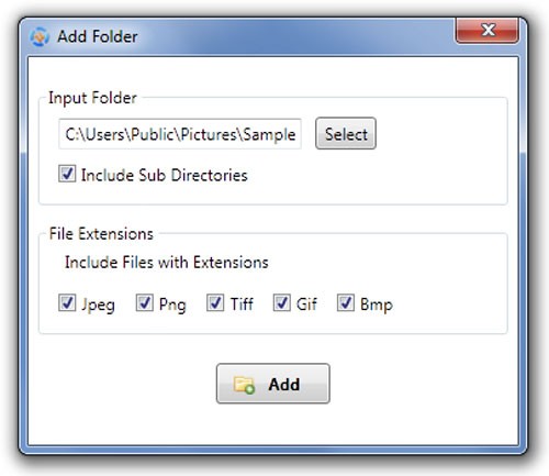 Để bắt đầu, bạn hãy chọn mục Add Folder và chỉ định đến thư mục chứa những bức ảnh cần thêm bản quyền, sau đó nhấn Add để xác nhận.