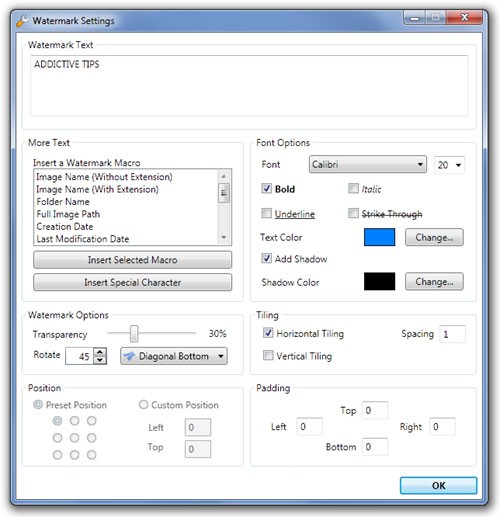 Sau khi đã thêm ảnh vào chương trình, hãy nhấn Add Watermark và chọn Add Text Watermark để mở ra cửa sổ Watermark Settings. Tại đây, bạn có thể nhập nội dung chữ, điều chỉnh các tùy chọn liên quan và nhấn Ok để lưu lại.
