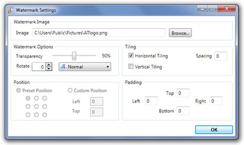 Nếu bạn muốn chèn một hình ảnh làm dấu bản quyền, hãy nhấn Add Watermark và chọn Add Image Watermark. Trong mục Watermark Settings, nhấn Browse để chọn ảnh mong muốn và tùy chỉnh theo yêu cầu. Cuối cùng, nhấn Ok để hoàn tất.
