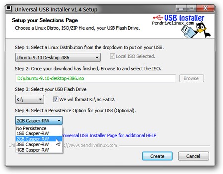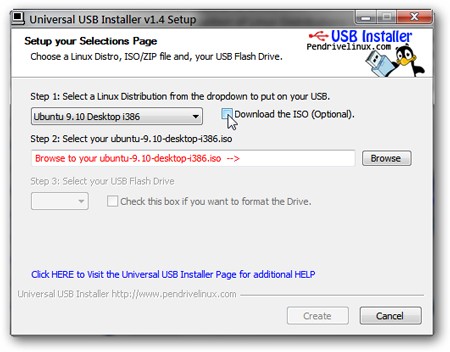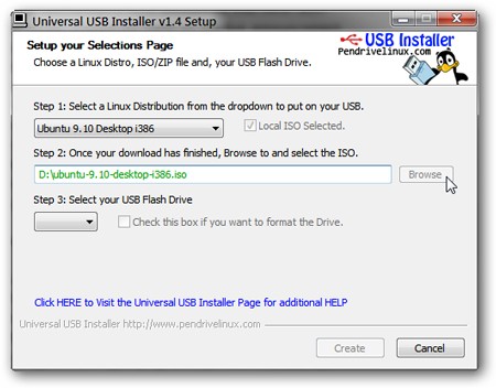 Ở hộp thả xuống trên màn hình tiếp theo, hãy chọn phiên bản Ubuntu 9.10 Desktop i386 trong mục Step 1 (select a Linux Distribution from the dropdown to put on your USB). Đừng lo lắng nếu bạn đang sử dụng hệ điều hành 64-bit, phiên bản 32-bit của Ubuntu 9.10 vẫn tương thích tốt. Một số tiện ích nhất định có thể không có sẵn trong phiên bản 64-bit, vì vậy, trừ khi bạn có kế hoạch chuyển đổi hoàn toàn sang Ubuntu, phiên bản 32-bit sẽ là lựa chọn tối ưu.