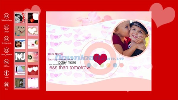 Valentine's Collage được đánh giá cao nhờ giao diện thân thiện và dễ dàng thao tác, được chia thành một số phần chính. Ở khu vực trên cùng là Valentine Cards, nơi tập hợp các mẫu thiệp điện tử với chủ đề Valentine đầy lãng mạn.