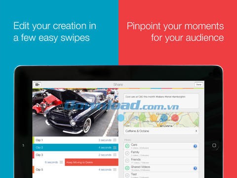 Chỉ cần kéo hoặc vuốt để sắp xếp lại hoặc xóa các clip sau khi quay xong. Chạm hai lần để gắn thẻ địa lý nhanh chóng, đồng thời chia sẻ và thêm mô tả chi tiết cho video của bạn.