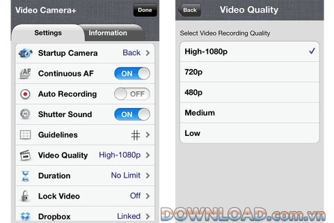 Với Video Camera+, bạn có thể tùy chỉnh chất lượng video, thiết lập bộ đếm thời gian quay, điều chỉnh độ dài video theo nhu cầu sử dụng.