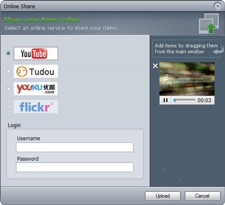 Phần mềm VideoFlick cho phép người dùng tải lên hình ảnh và video lên bốn dịch vụ phổ biến: Youtube, Tudou, Youku và Flickr. Quá trình tải lên rất đơn giản, bạn chỉ cần chọn tệp tin cần chia sẻ, sau đó sử dụng chức năng Online được tích hợp trong thanh công cụ chính.