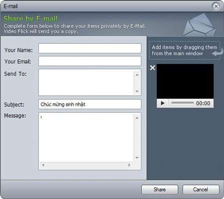 Việc gửi ảnh hoặc video không còn đòi hỏi bạn phải mở tài khoản email cá nhân. Bạn hoàn toàn có thể thực hiện thao tác này trực tiếp từ VideoFlick.