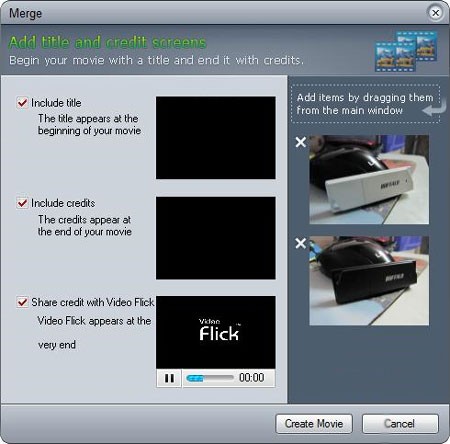 Trong hộp thoại Merge hiện ra, hãy đánh dấu chọn mục Include title nếu bạn muốn thêm phần giới thiệu cho trình chiếu, và nhập nội dung giới thiệu vào ô tương ứng. Tương tự, đánh dấu chọn mục Include credits để tạo đoạn kết thúc, đồng thời chọn Share credit with VideoFlick nếu muốn hiển thị logo của VideoFlick ở cuối trình chiếu.