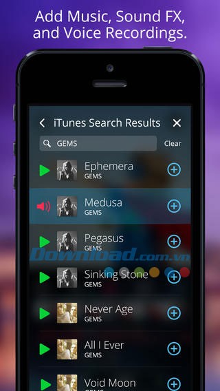 Nhập các tệp nhạc từ thư viện iTunes và lựa chọn các hiệu ứng âm thanh phù hợp để làm phong phú thêm cho video của bạn.