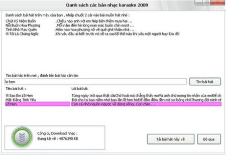 Trong giao diện hiện ra, nhập tên bài hát vào ô nhập liệu đã được cung cấp (việc nhập liệu không dấu hoàn toàn được hỗ trợ). Sau đó, nhấn nút Tìm bài hát. Danh sách các bài hát phù hợp với từ khóa tìm kiếm sẽ được hiển thị ngay lập tức. Nếu không tìm thấy kết quả, có thể bài hát đó chưa được cập nhật trong hệ thống dữ liệu của phần mềm.