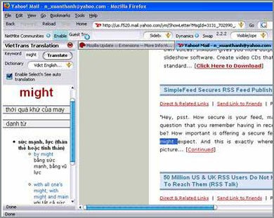 Một công cụ hỗ trợ dịch thuật ngôn ngữ Việt do bạn Giao Trinh phát triển, được chia sẻ rộng rãi đến cộng đồng người sử dụng trình duyệt Firefox. Sau khi hoàn tất quá trình cài đặt, tiện ích sẽ tự động hiển thị trên giao diện khi bạn truy cập vào menu View\ Side Bar\ VietTrans Translation hoặc sử dụng phím tắt Ctrl+Shift+V.