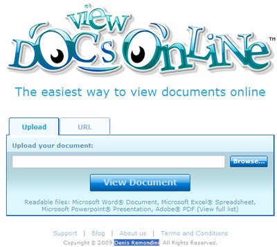 View Docs Online cho phép bạn xem các tài liệu trực tuyến một cách dễ dàng, chỉ cần một trình duyệt web có hỗ trợ Flash. Dịch vụ này tương thích với nhiều định dạng khác nhau, bao gồm PDF, TXT, RTF, các định dạng của Microsoft Office 2003 và 2007, cũng như Open Office (odt, odp, sxw, sxi)…