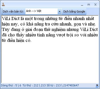 ViLi Dict cập nhật khả năng dịch văn bản tiếng Anh trực tuyến, tra từ nhanh chóng bằng cách copy và dán, đồng thời tối ưu dung lượng và tốc độ khởi động. Ứng dụng còn hỗ trợ tìm từ gần đúng theo danh mục và tra cứu/dịch nhanh bằng phím tắt Ctrl+Q hoặc Ctrl+W.