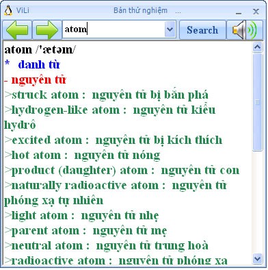 Phiên bản thử nghiệm của ViLi Dict bao gồm hai từ điển chính là Anh Việt và Việt Anh.